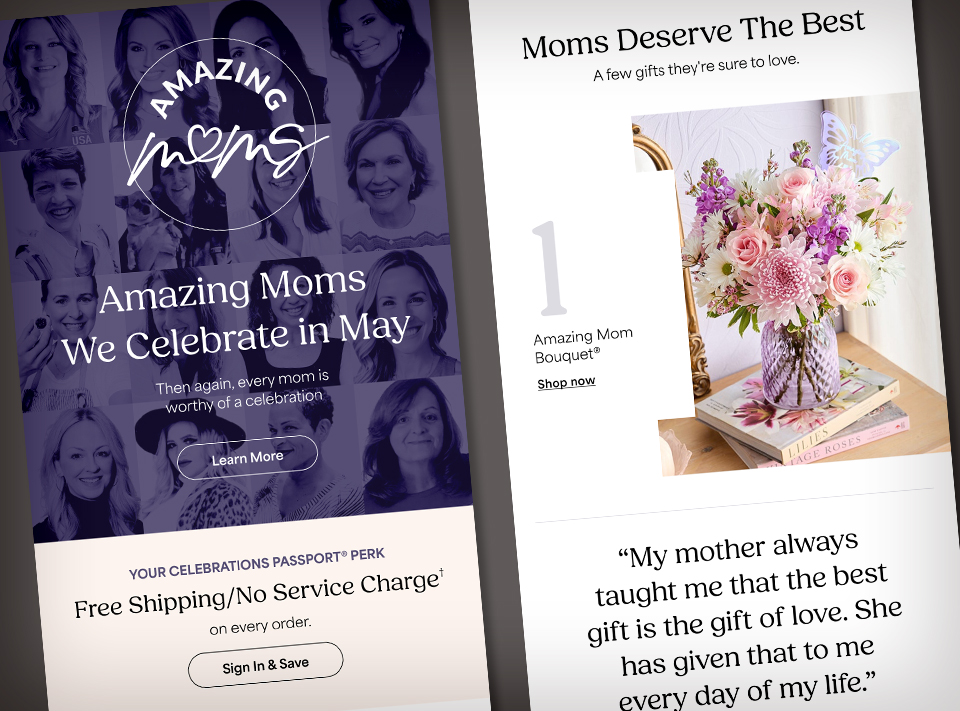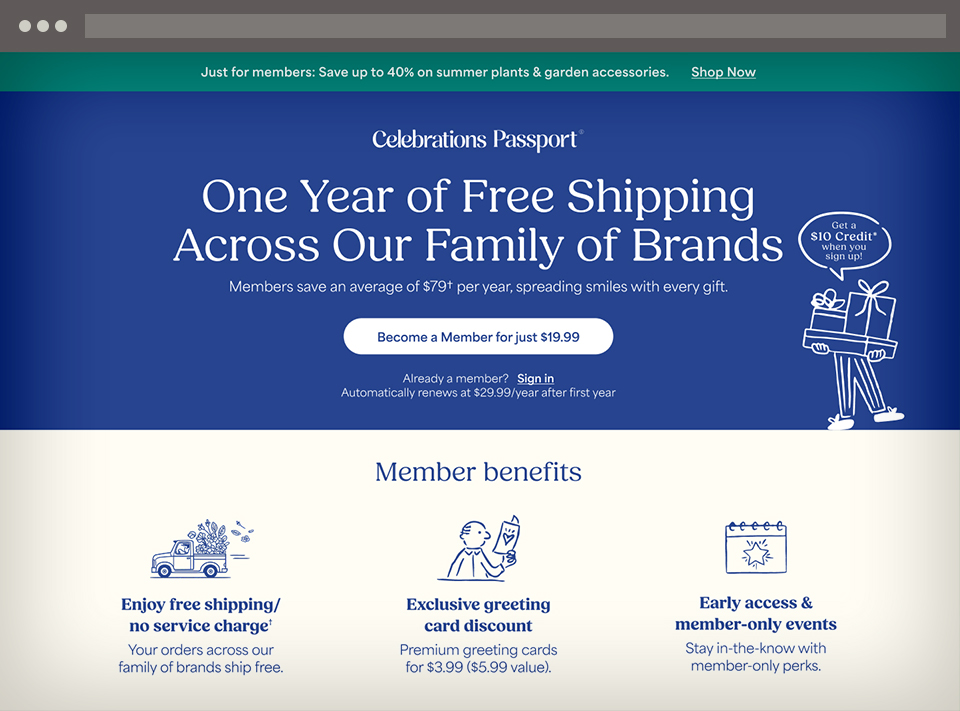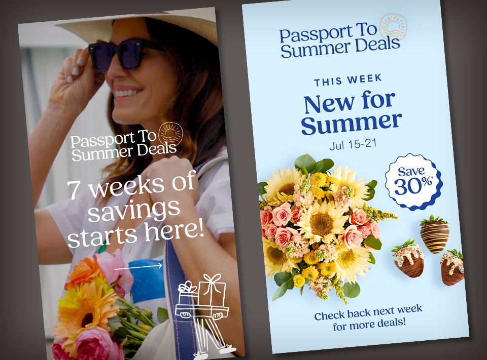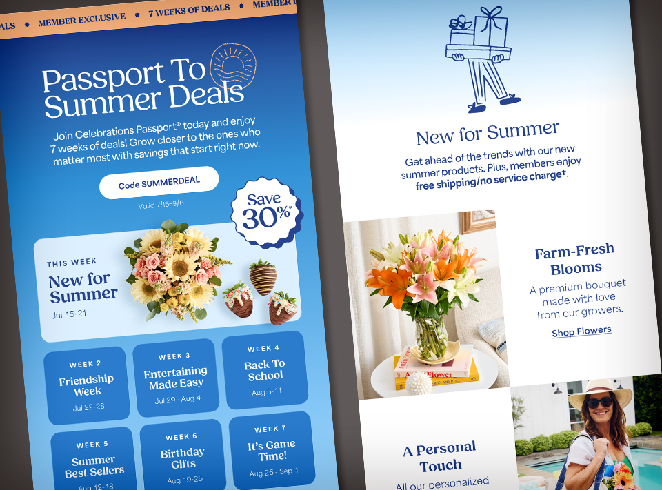 Celebrations Passport® is a loyalty program that offers free standard shipping and no service charges on eligible gifts across the 1-800-Flowers Family of Brands — plus exclusive member offers and seasonal surprises throughout the year. My main goal as the designer was to elevate the look and feel to reflect a cross-brand experience that brings forward our expertise and emotional intelligence around gifting and connecting — which in turn creates and bolsters meaningful relationships.