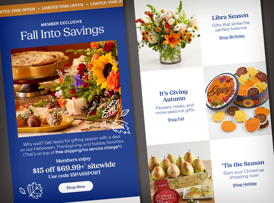 Celebrations Passport® is a loyalty program that offers free standard shipping and no service charges on eligible gifts across the 1-800-Flowers Family of Brands — plus exclusive member offers and seasonal surprises throughout the year. My main goal as the designer was to elevate the look and feel to reflect a cross-brand experience that brings forward our expertise and emotional intelligence around gifting and connecting — which in turn creates and bolsters meaningful relationships.
